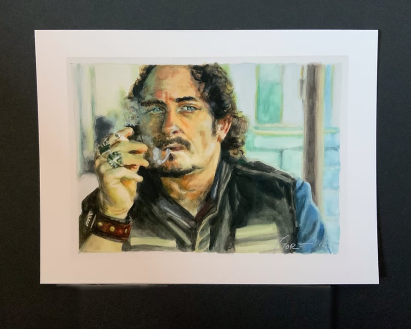 5x6.75 giclee print of my watercolor portrait of Kim Coates as Tig Trager in Sons of Anarchy. Printed on fine art velvet paper, trimmed to 6x8 with white borders. Ships flat with support.